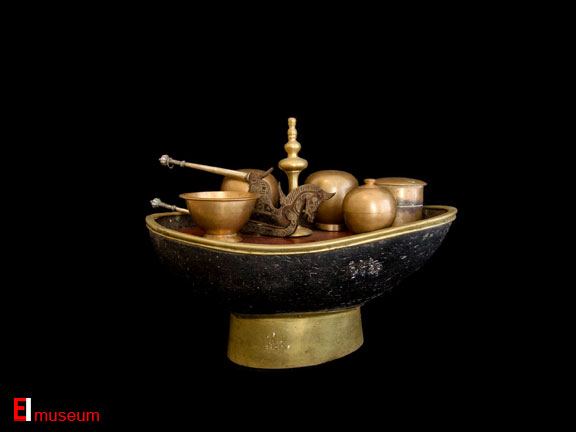KINANGAN Java, Indonesia 19th C Container made of rare, Seychelles coco-de-mer coconut shell & brass. Implements of "gongso" bronze and iron/silver kacip 23 x 30 cm The East Indies Museum IDN: 2-816-166