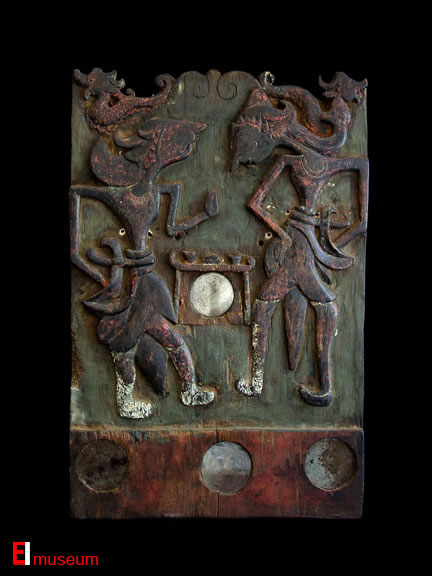 BLAWONG / WAYANG BLABAG Carved wooden board with wayang figures used for displaying a keris Central Java, Indonesia 19th C Teak wood, pigments 51 x 33 cm The East Indies Museum IDN: 2-891-172