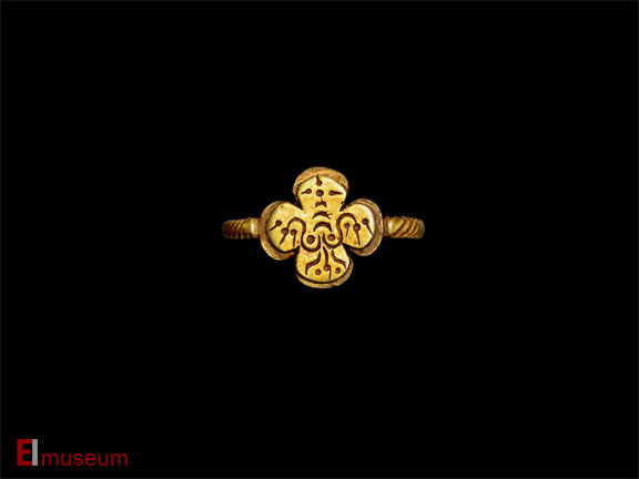 Cast gold with stepped raised bezel in the form of a quatrefoil stylized lotus. Incised with a motif symbolizing a lotus, a flower pot and a tree-of-plenty.