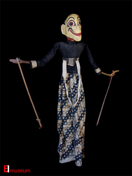 WAYANG GOLEK Central Java, Indonesia Early 20th C 3-dimensional puppet depicting "Toples" Wood, old batik