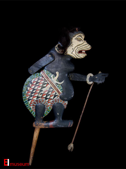 Wayang puppet depicting "Togog" Wood, leather, pigments