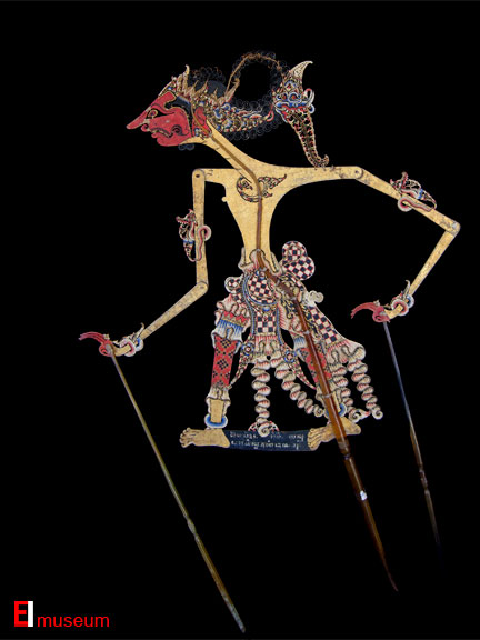 Central Java, Indonesia Early 20th C. Wayang puppet depicting "Setyaki" Buffalo hide, horn, gold leaf, pigments 69 cm The East Indies Museum IDN: 2-986-193