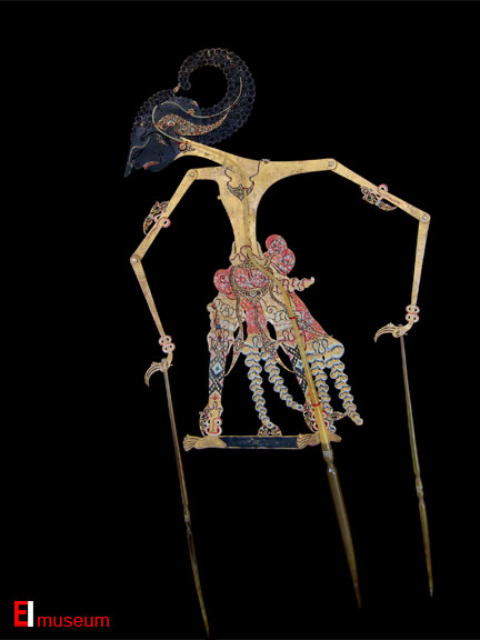 Wayang puppet depicting "Bambang" Buffalo hide, horn, gold leaf, pigments 71 cm The East Indies Museum IDN: 29-2138-379