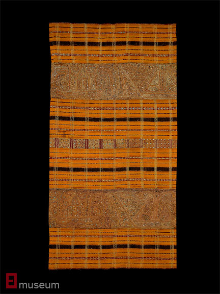 Hand-spun cotton, silk, mica chips, gold thread, supplementary weft weave, ikat, embroidery, applique
